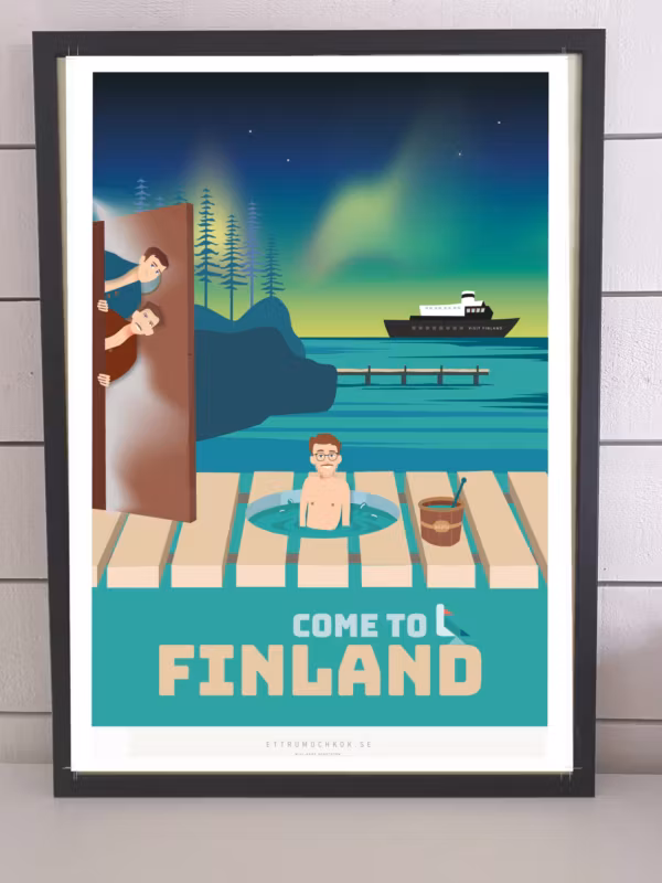 Poster Come to Finland för dig som vill uppleva känslan av att bada bastu och uppleva norrskenet.