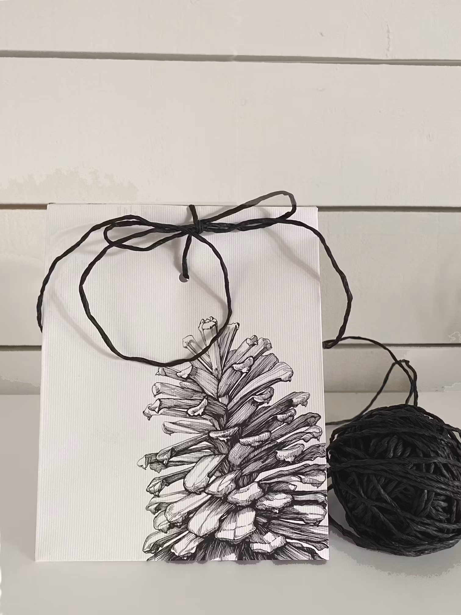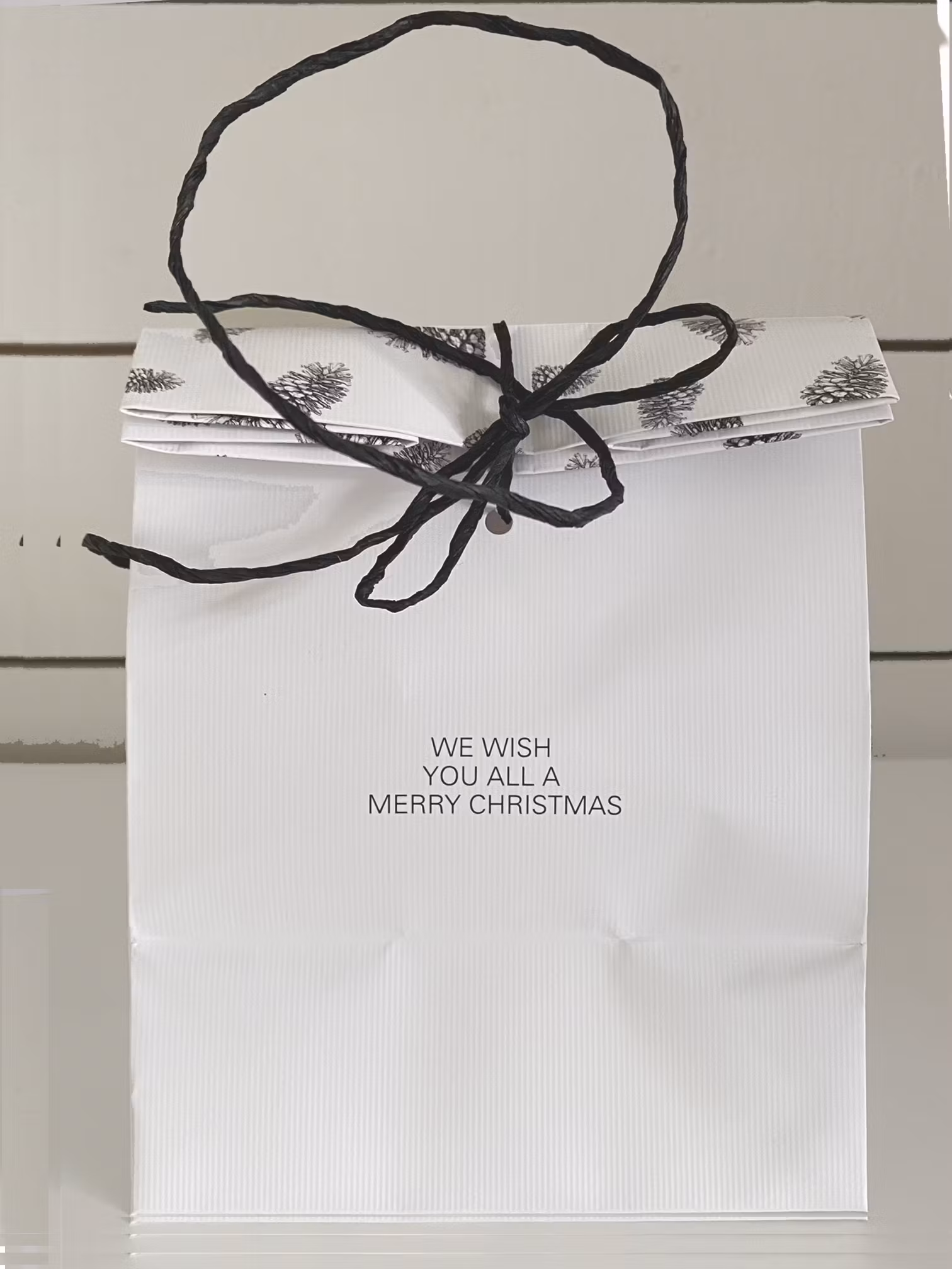 Presentpåse i kraftigt vitt räfflat papper, med tryck av en granskotte och citat på baksidan "WE WISH YOU ALLA A MERR Y CHRISTMAS".